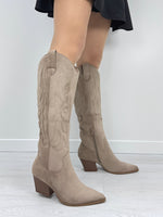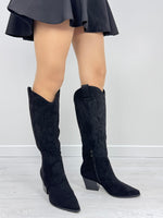 Il modello Willow è uno stivale texano in suede nero e beige , con punta affusolata e tacco squadrato che slancia la silhouette. Il ricamo tono su tono sul gambale aggiunge un tocco western deciso e sofisticato.