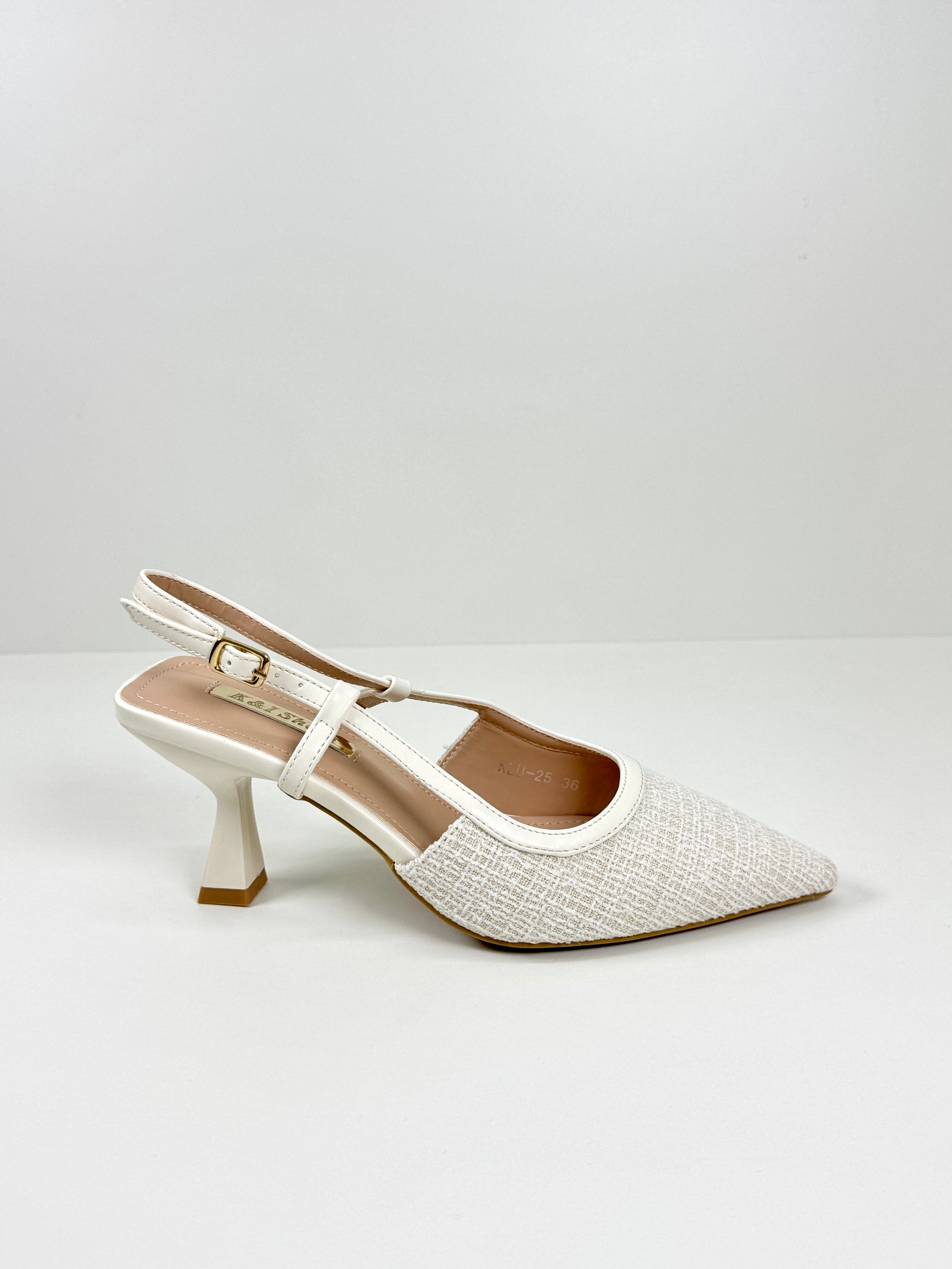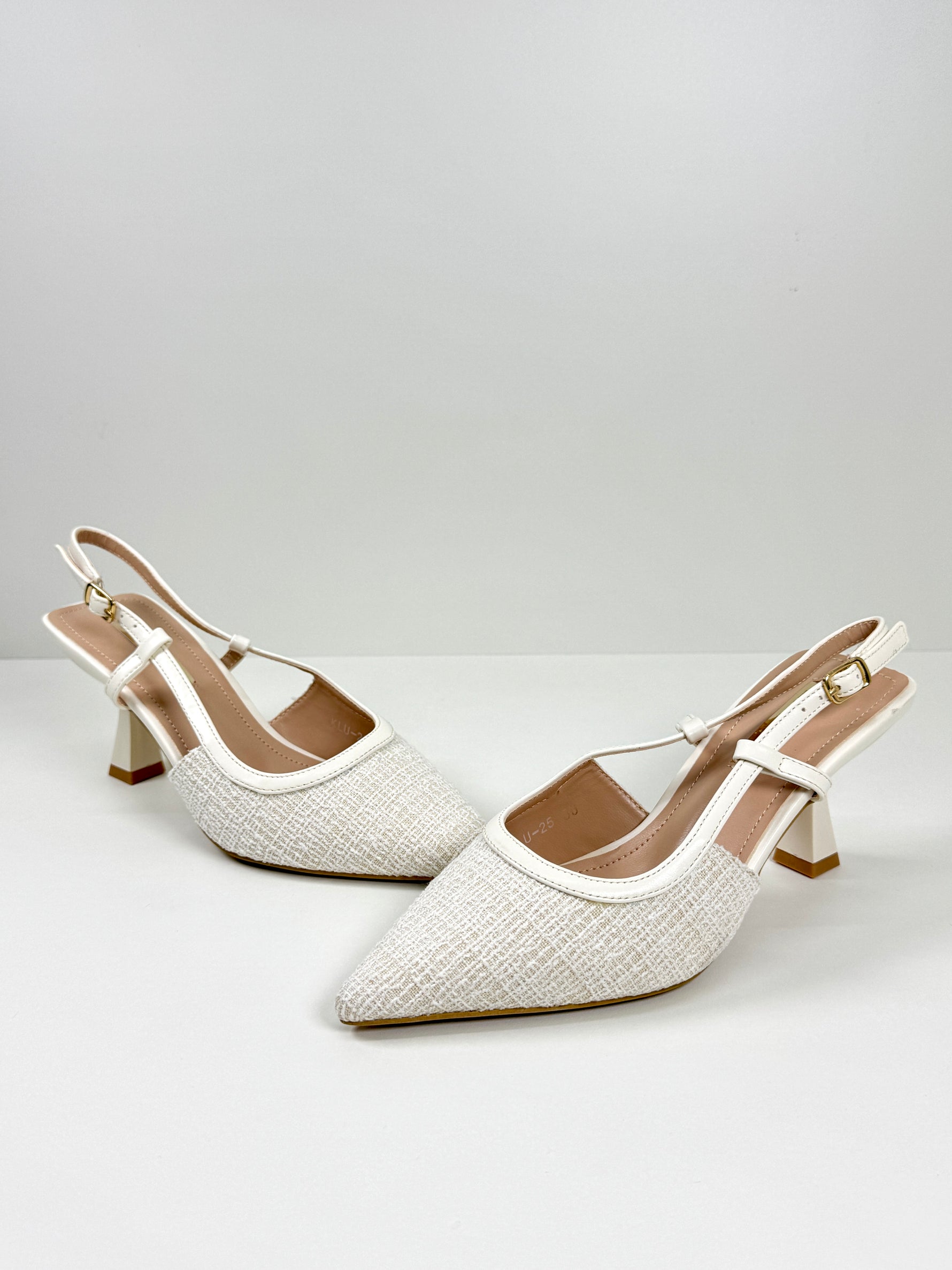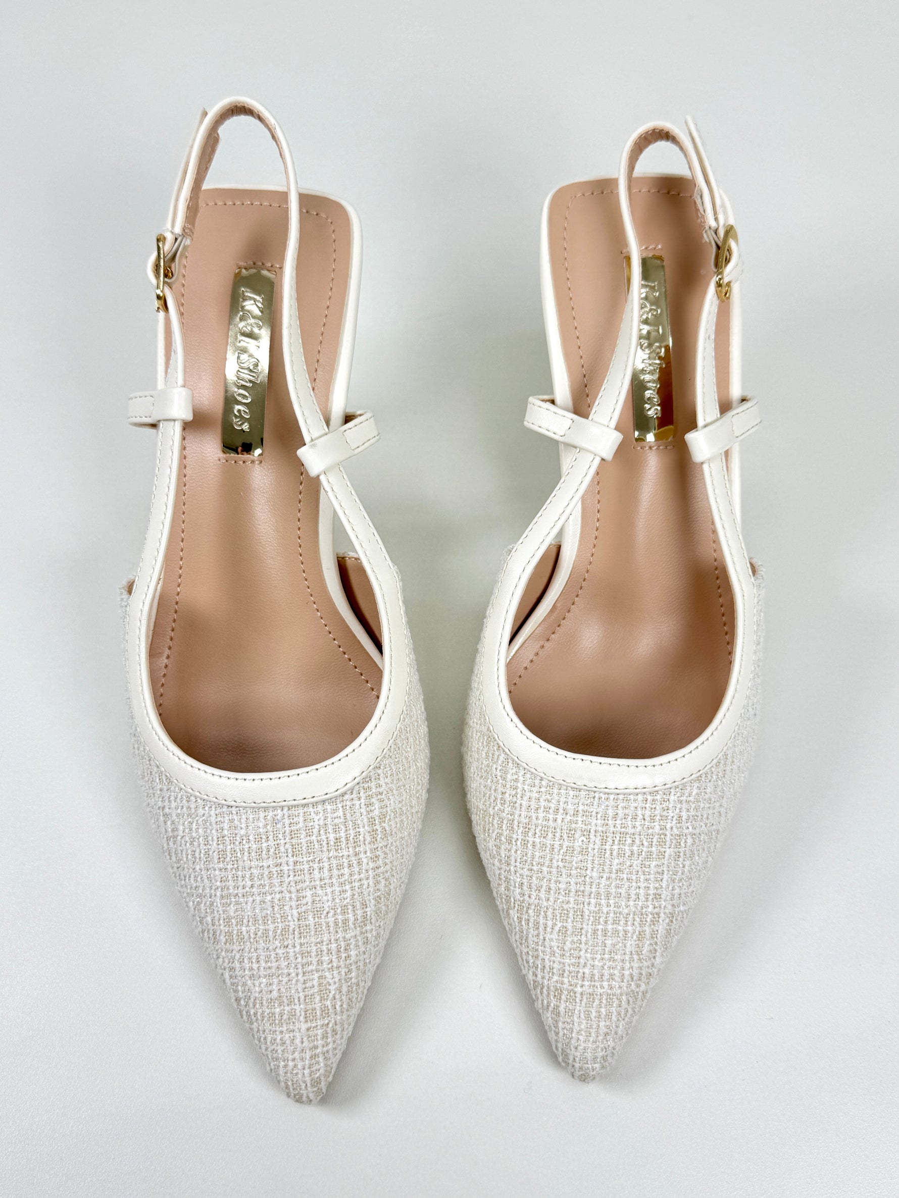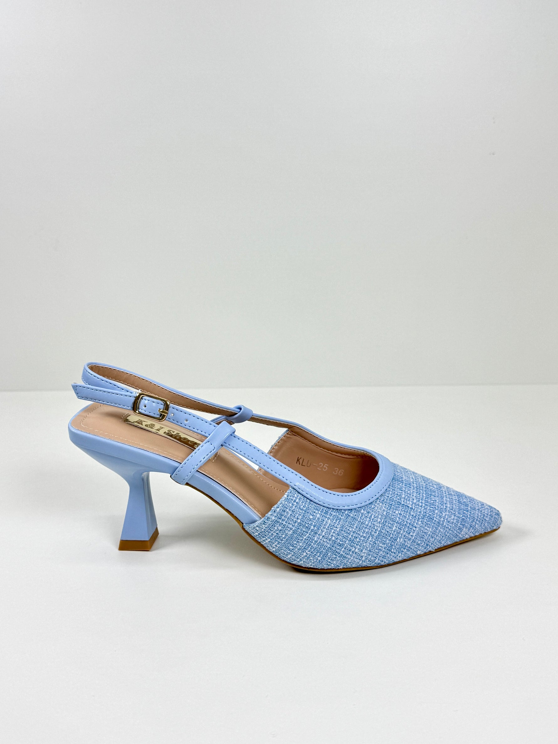 Le slingback Noelle sono realizzate in tweed con dei piccoli dettagli luccicosi. Disponibili in Azzurro e Beige.