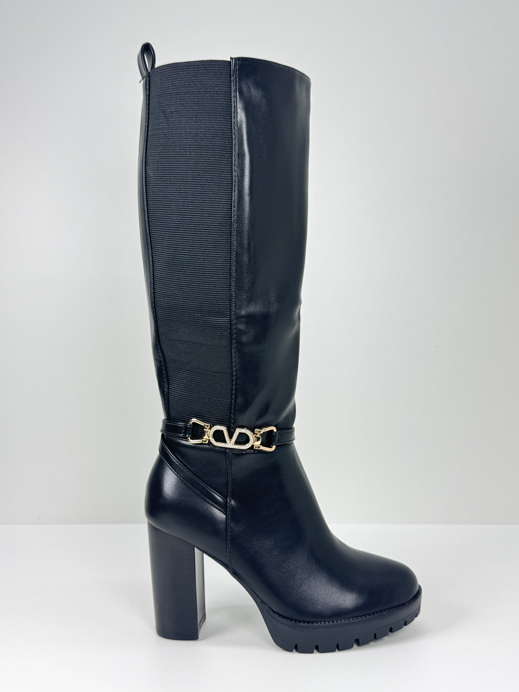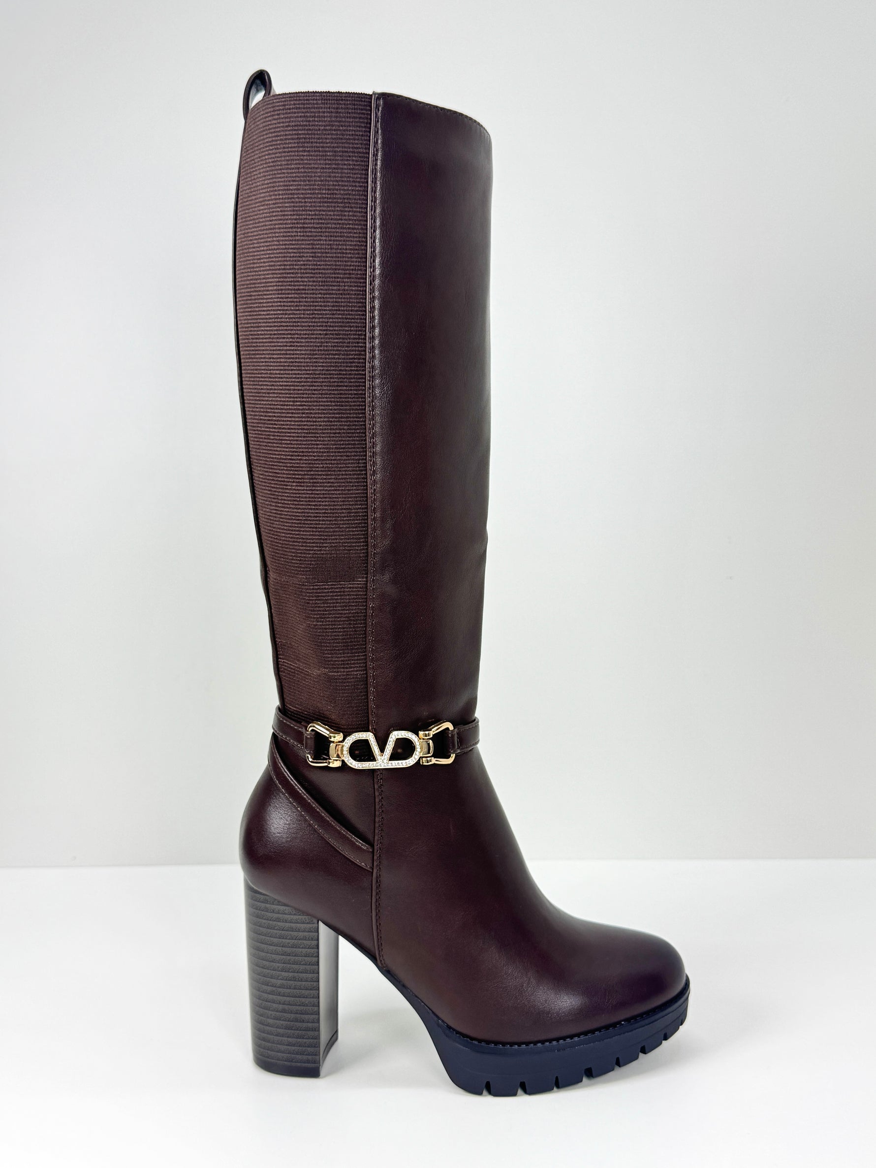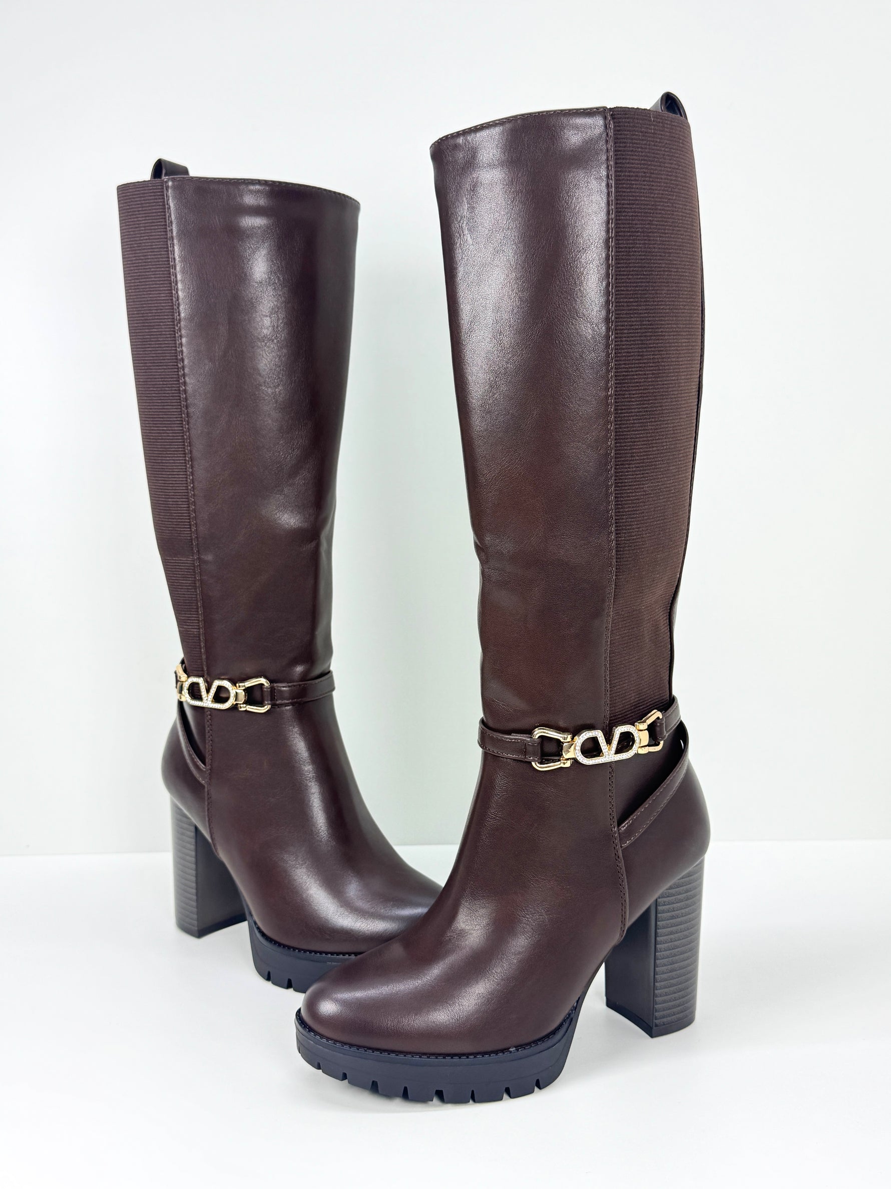 Lo stivale Scarlett è alto in ecopelle Marrone e Nero, inserti elasticizzati laterali per una calzata confortevole. Ha un dettaglio  gioiello dorato con logo sul cinturino alla caviglia. Tacco largo a blocco e suola carrarmato antiscivolo per un look elegante e deciso.