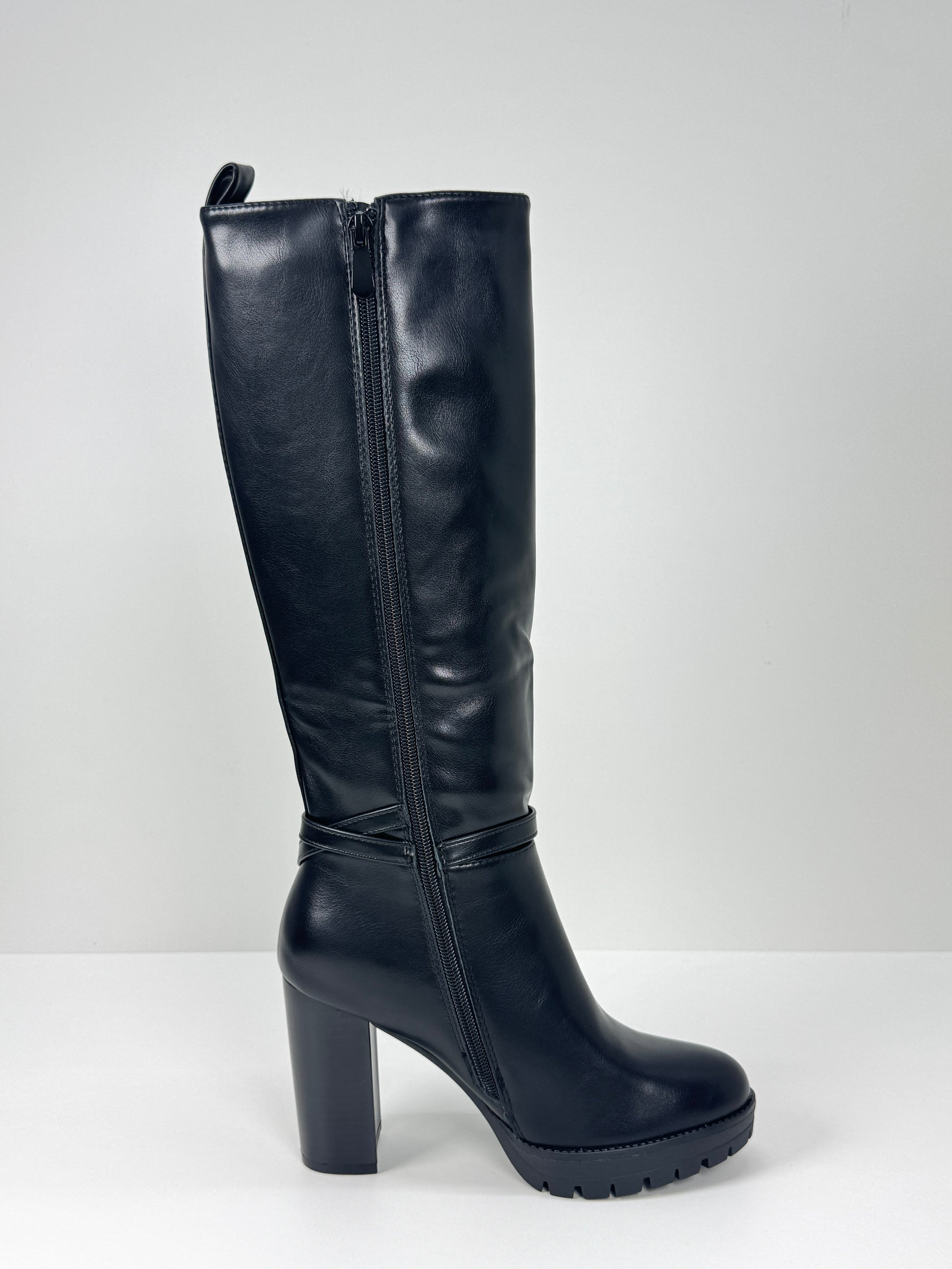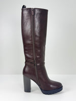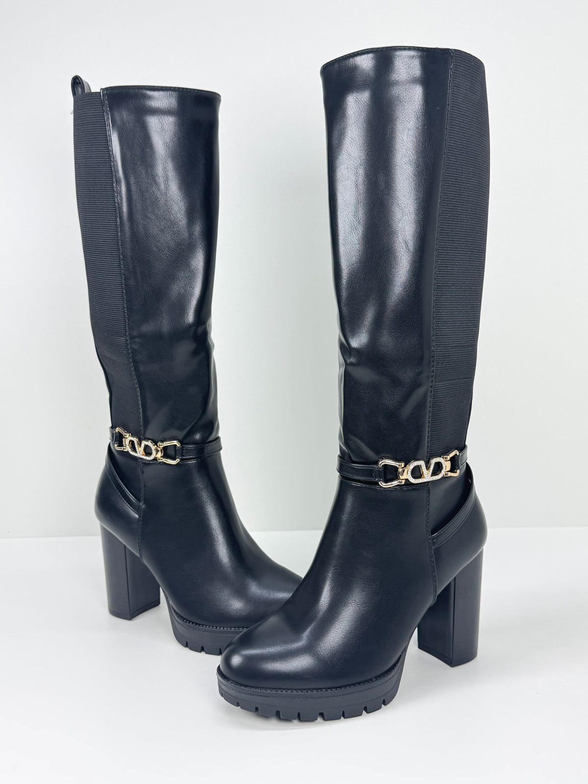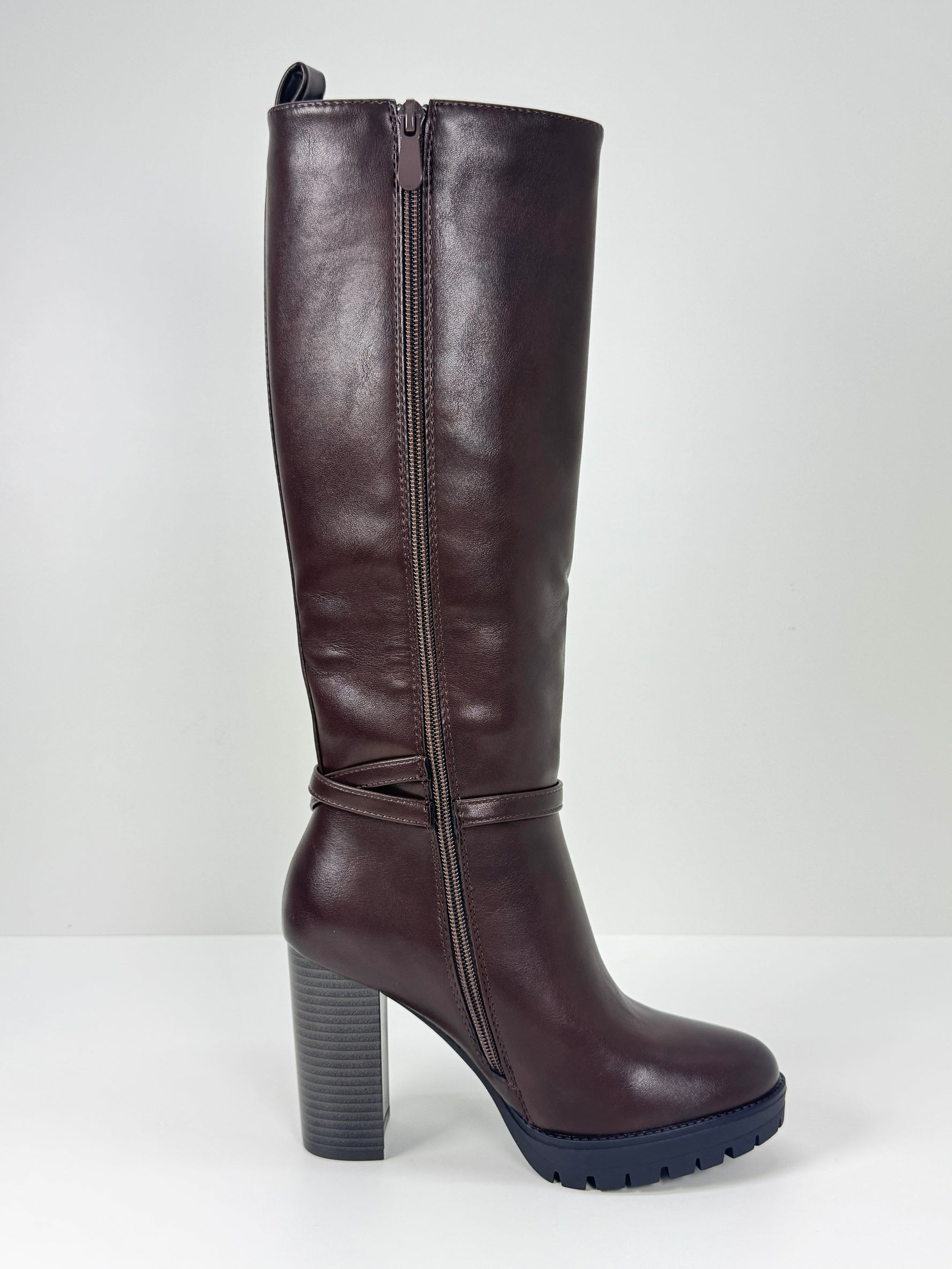 Lo stivale Scarlett è alto in ecopelle Marrone e Nero, inserti elasticizzati laterali per una calzata confortevole. Ha un dettaglio  gioiello dorato con logo sul cinturino alla caviglia. Tacco largo a blocco e suola carrarmato antiscivolo per un look elegante e deciso.