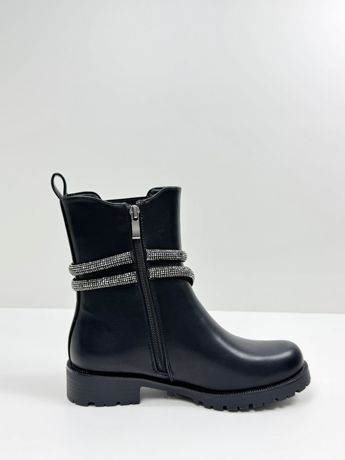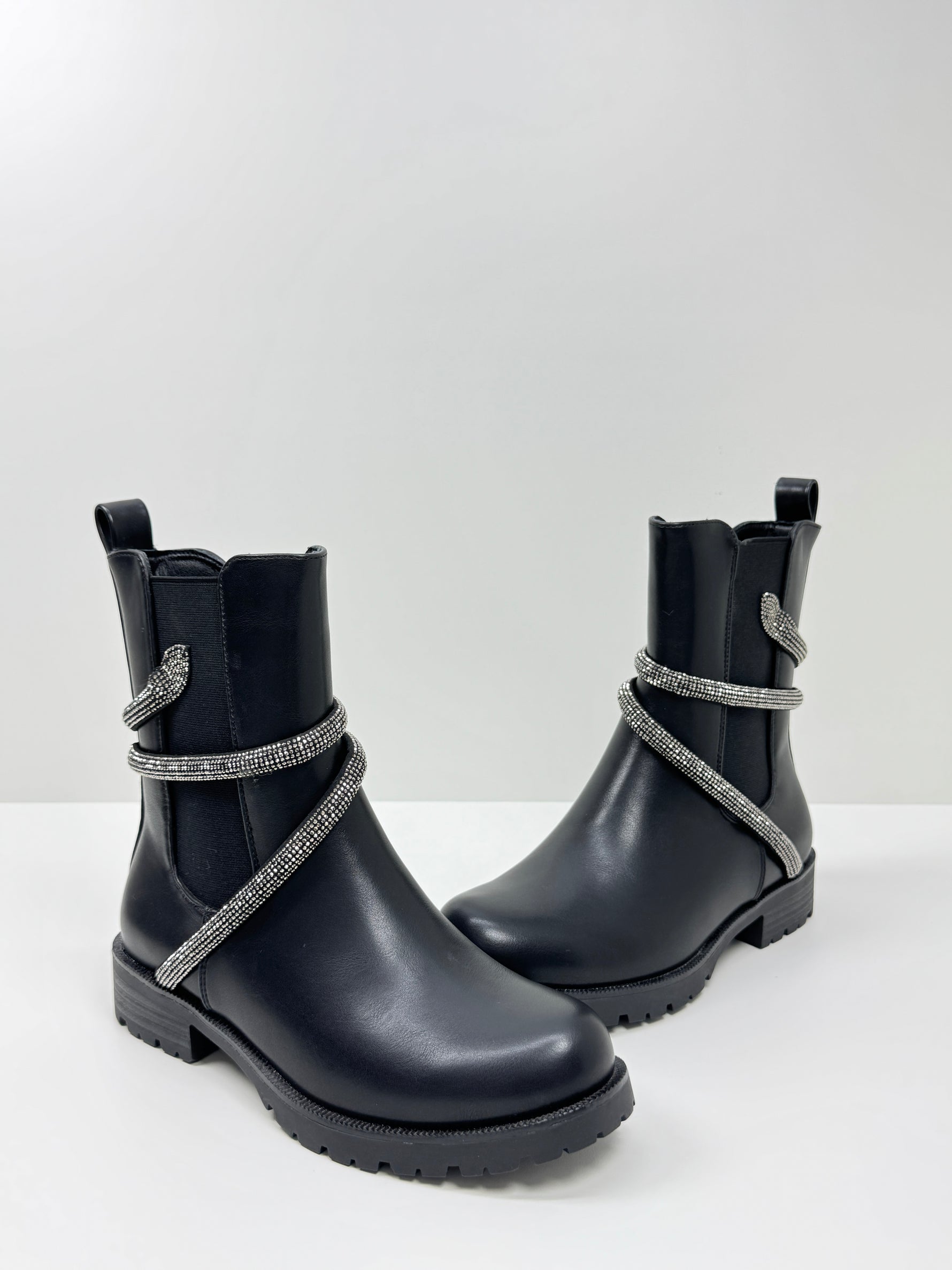 Gli stivaletti Soleil si distinguono per la loro decorazione unica a effetto serpente realizzata con strass argento su tutta la superficie. Dotati di zip completa interna e molla laterale, garantiscono facilità di calzata e comfort. Perfetti per chi cerca uno stile alla moda con un tocco di brillantezza e originalità.