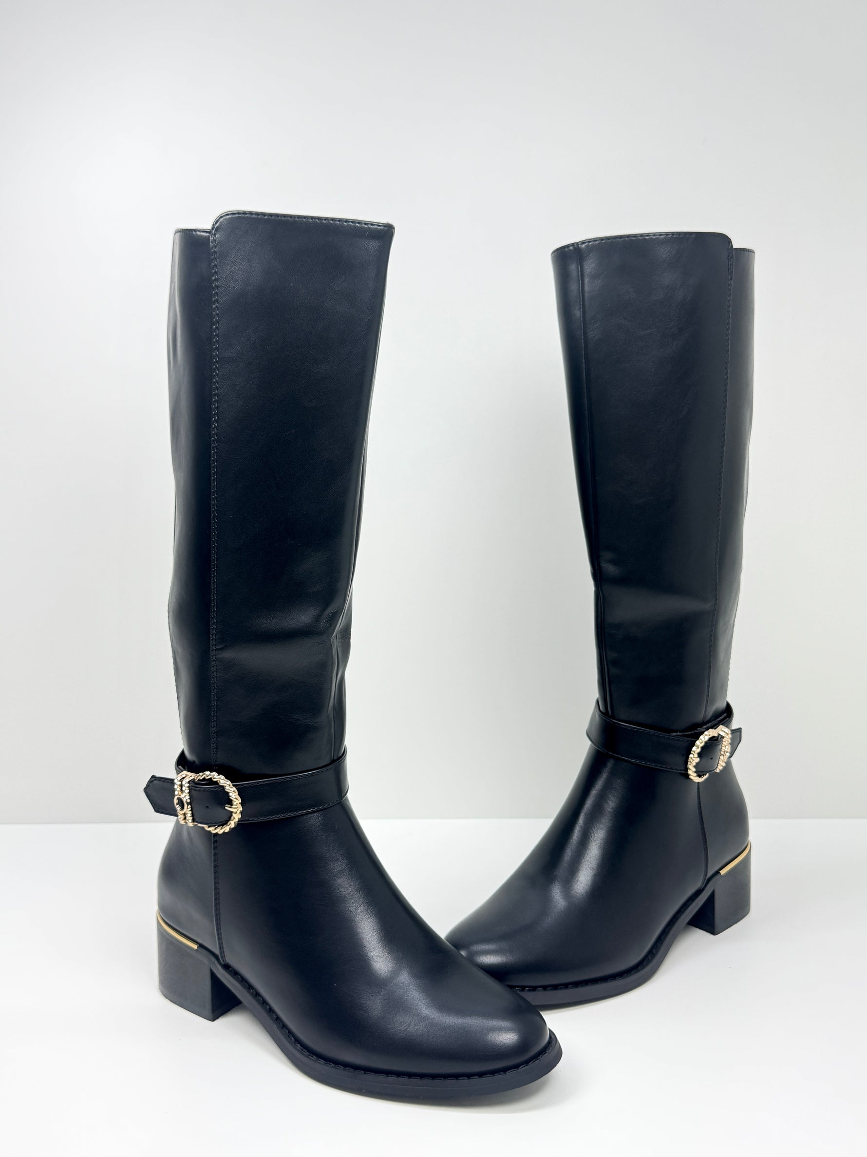 Gli stivali Monica offrono un tocco di eleganza quotidiana con decorazioni in oro che valorizzano ogni passo. La suola antiscivolo garantisce sicurezza e stabilità, mentre il comodo tacchetto largo assicura comfort per tutto il giorno.